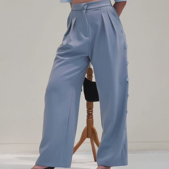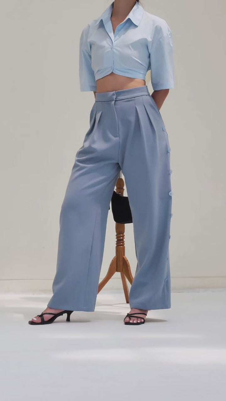 The Hayashi Pants feature a high-waisted, gently wide-leg cut that works for both casual and more dressed-up days. An array of buttons runs along the sides, adding a subtle accent that makes them stand out from your other trousers.